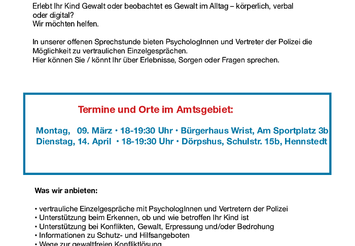 Für Eltern, Kinder & Jugendliche In unserer offenen Sprechstunde bieten PsychologInnen und Vertreter der Polizei die Möglichkeit zu vertraulichen Einzelgesprächen.