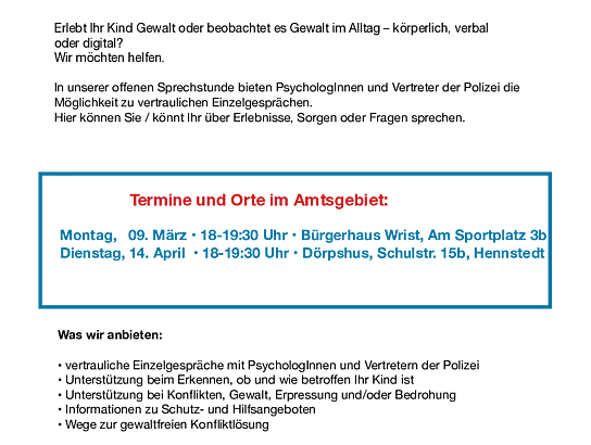 Für Eltern, Kinder & Jugendliche In unserer offenen Sprechstunde bieten PsychologInnen und Vertreter der Polizei die Möglichkeit zu vertraulichen Einzelgesprächen.