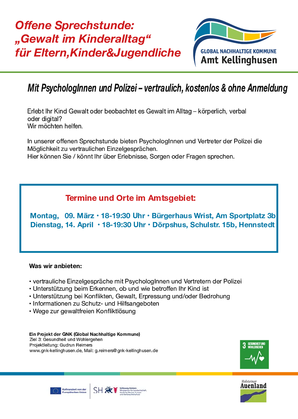 Die GNK hat mit dem Amt eine Offene Sprechstunde für Eltern, Kinder und Jugendliche ins Leben gerufen, die anonym, kostenlos und ohne Anmeldung ist.