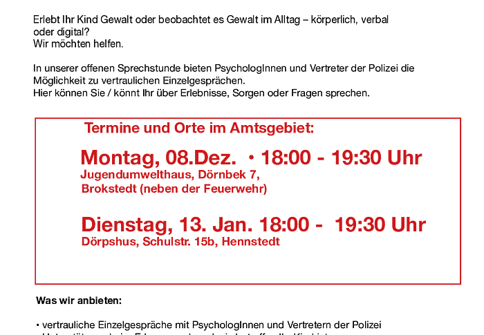 Offene Sprechstunde: „Gewalt im Kinderalltag“ für Eltern,Kinder & Jugendliche Mit PsychologInnen und Polizei – vertraulich, kostenlos & ohne Anmeldung